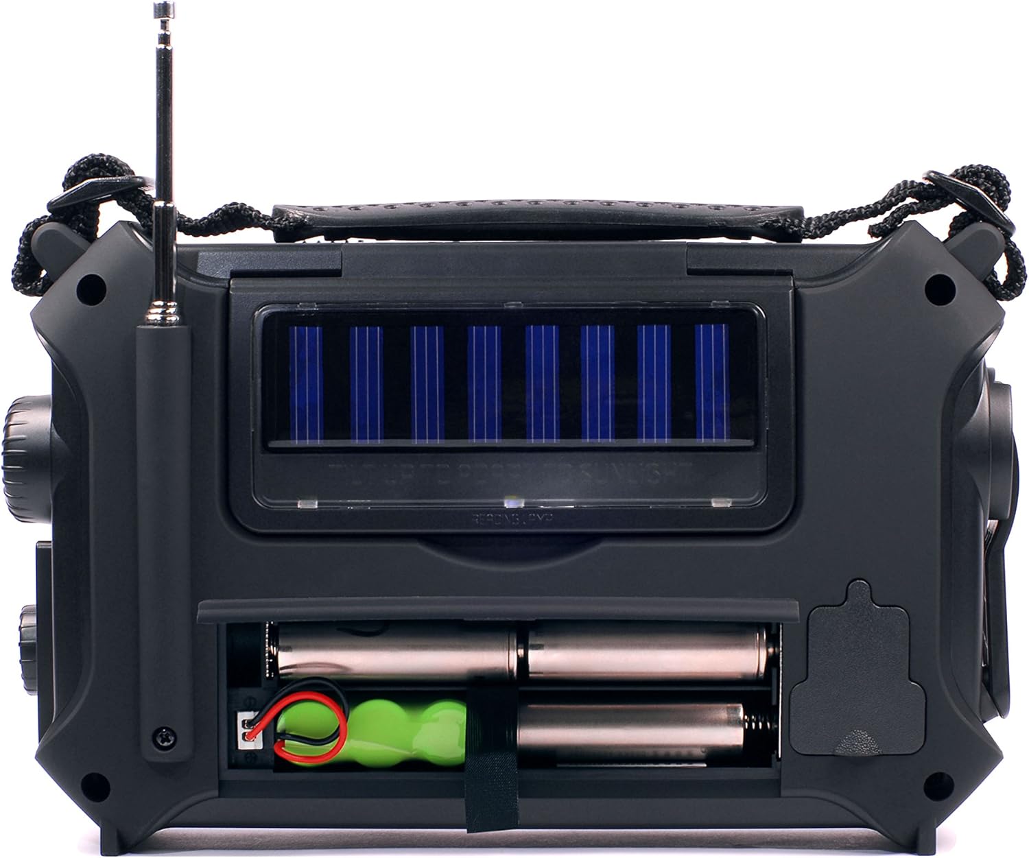 5-way powered emergency radio: AC, battery, hand crank, solar, computer